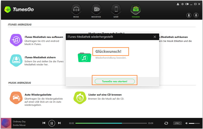 Sobald die Bibliothek wiederhergestellt ist, erhalten Sie eine Glückwunsch-Mitteilung und Sie werden zu einem Neustart von TunesGo aufgefordert, um die geupdatete iTunes Bibliothek zu erhalten.
