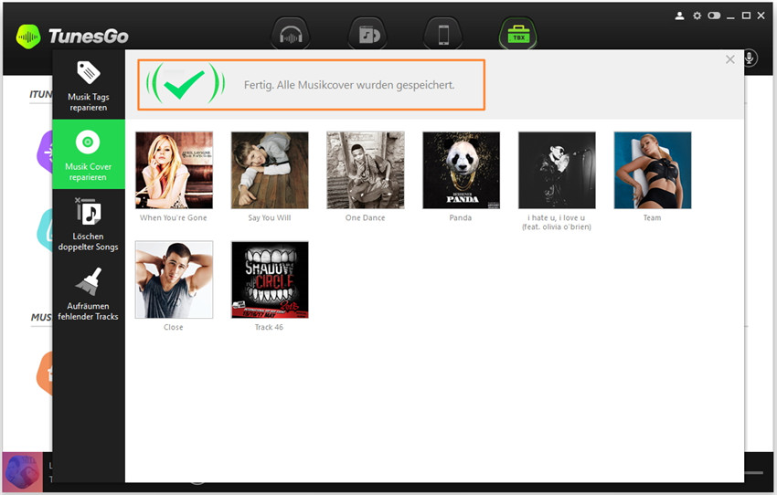 b. TunesGo zeigt eine Mitteilung nach erfolgreicher Reparatur von Albumcovern.