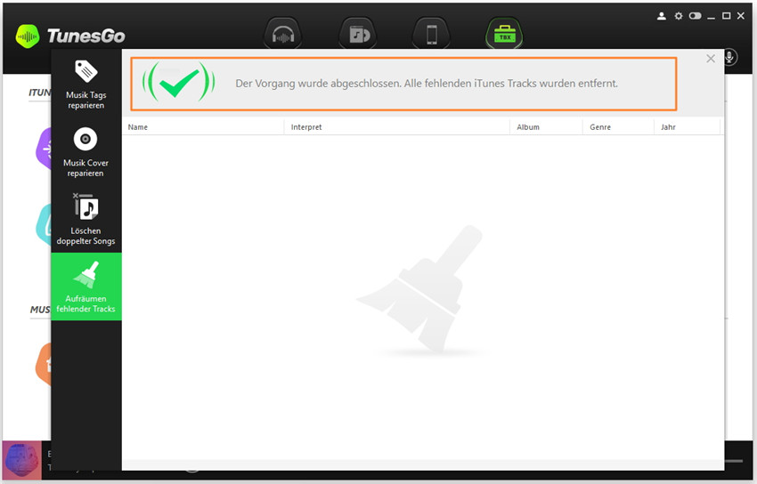 d. TunesGo zeigt eine Mitteilung nach erfolgreicher Säuberung fehlender Tracks.